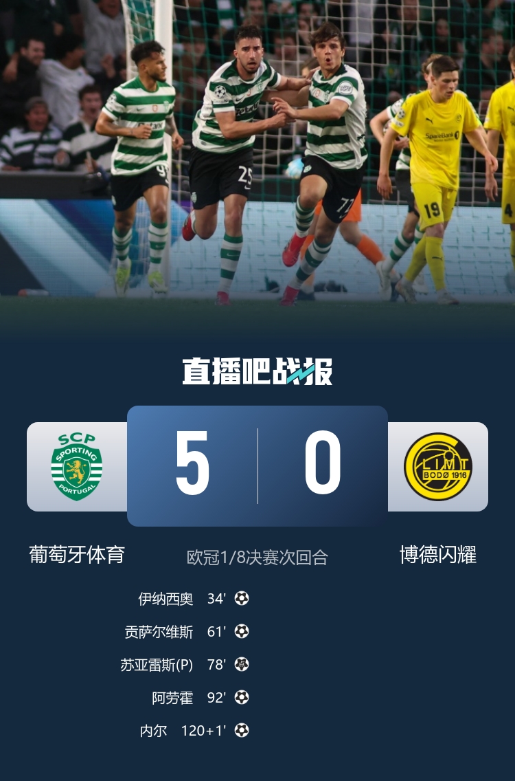 第120+1分钟,葡体前场断球,布拉干萨送助攻,内尔锁定胜局,葡萄牙体育5-0,总比分5-3博德闪耀↓