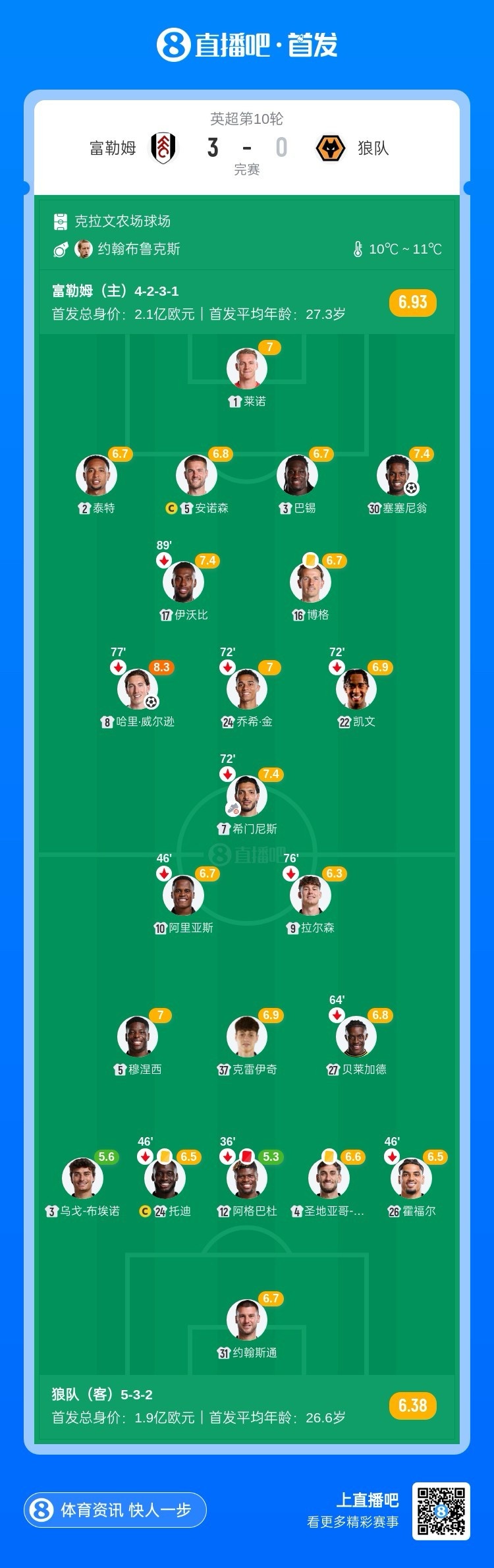 终结联赛四连败!富勒姆3-0十人狼队 狼队开局10轮不胜仍垫底