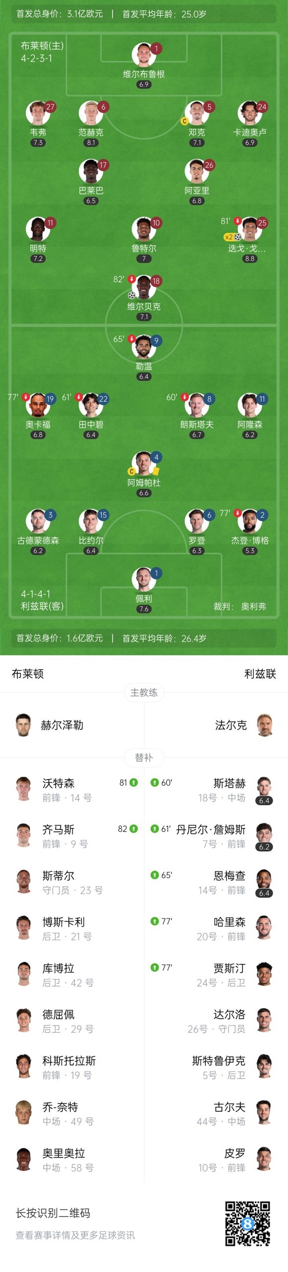 下半场补时4分钟,布莱顿3-0利兹联。