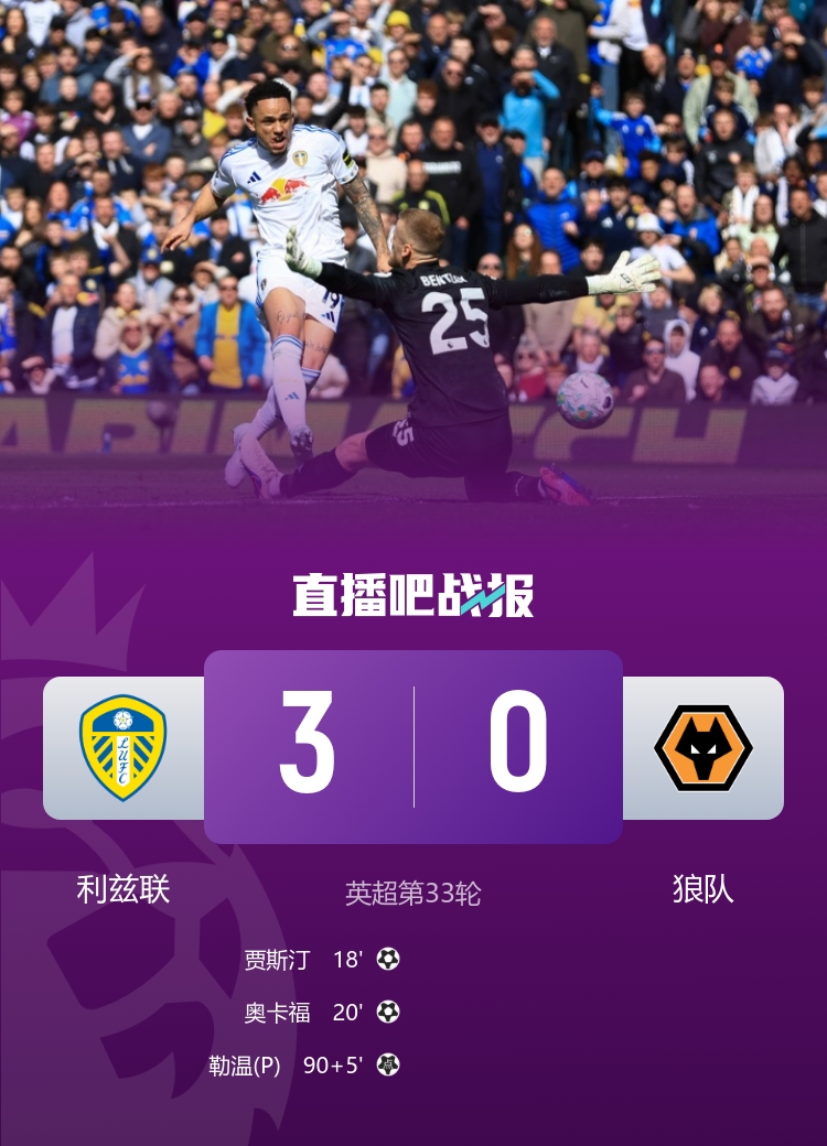 4月19日讯 北京时间4月18日22:00,2025/26赛季英超第33轮,利兹联在埃兰路球场迎战狼队。上半场,贾斯汀、奥卡福两分钟内先后破门;下半场,罗德里戈·戈麦斯造险,勒温在补时阶段点射再下一城,最终利兹联以3-0主场击败狼队。积分榜方面,利兹联积39分排在第15位,狼队积17分继续排名垫底。