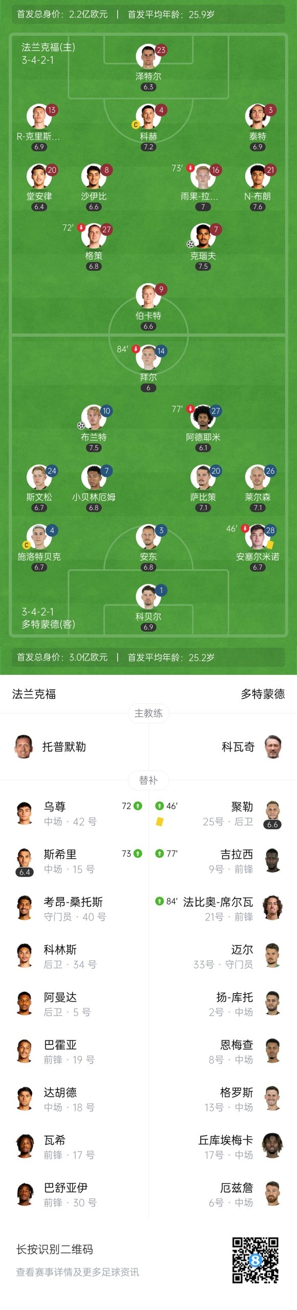 第47分钟,多特扳平比分!莱尔森右路横传禁区后点布兰特包抄推射破门,法兰克福1-1多特。↓