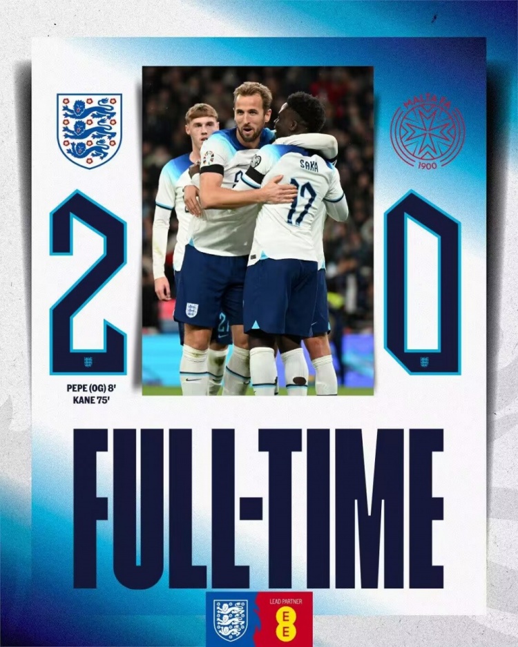欧预赛-英格兰2-0马耳他锁头名 凯恩破门福登造乌龙赖斯进球被吹