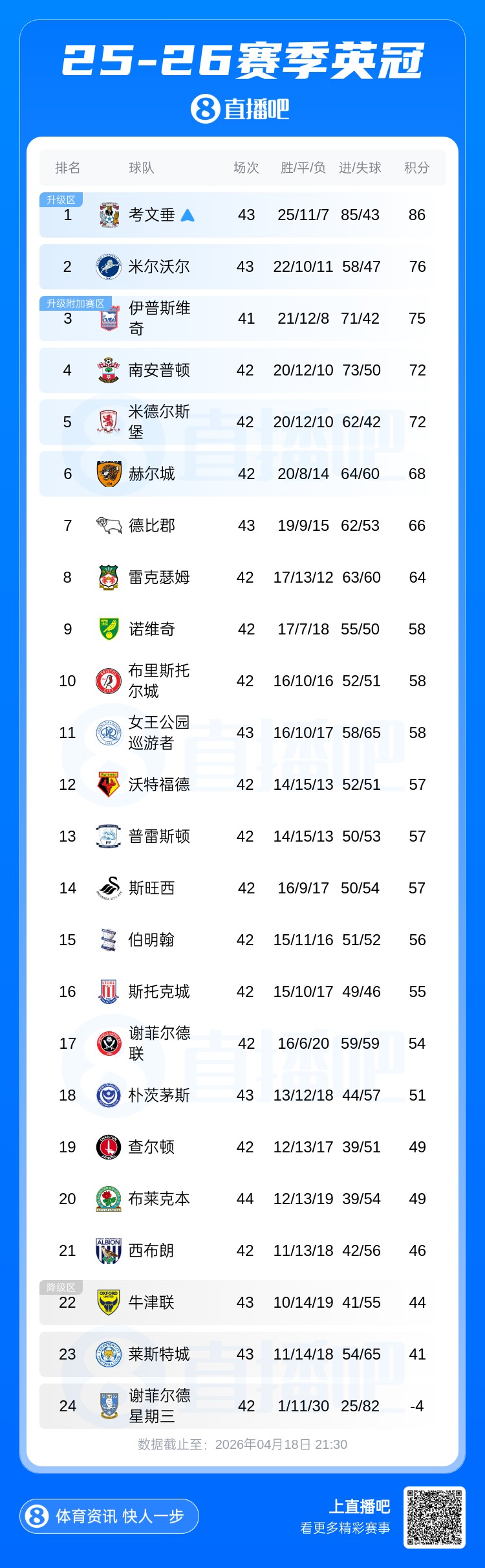 04月18日讯 英冠第43轮,莱斯特城客场0-1负于朴茨茅斯,输掉与保级竞争对手的直接较量,继续排名英冠倒数第二。比赛第63分钟,朴茨茅斯打进全场唯一进球在英冠积分榜上,莱斯特城43场积41分(财务违规被扣6分)...发表于:04月18日