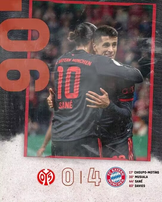 2月2日讯 北京时间2月2日03:45,德国杯1/8决赛拜仁客场挑战美因茨的比赛,上半场坎塞洛首秀助攻舒波-莫廷破门,穆西亚拉低射建功,萨内推射破门,下半场戴维斯替补建功,哈克两黄变一红被罚下,最终拜仁客场4-0十人美因茨成功晋级八强。