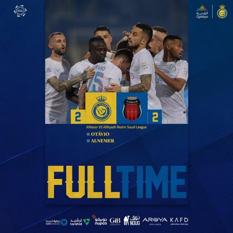 5月24日讯 沙特联第33轮,利雅得胜利客战利雅得体育。上半场,奥塔维奥折射破门;C罗失单刀;随后利雅得胜利连丢两球被反超。下半场,拉波尔特拳击对手后背,被红牌罚下!内梅尔补时绝平!最终,利雅得胜利2-2战平利雅得体育,联赛两连平。