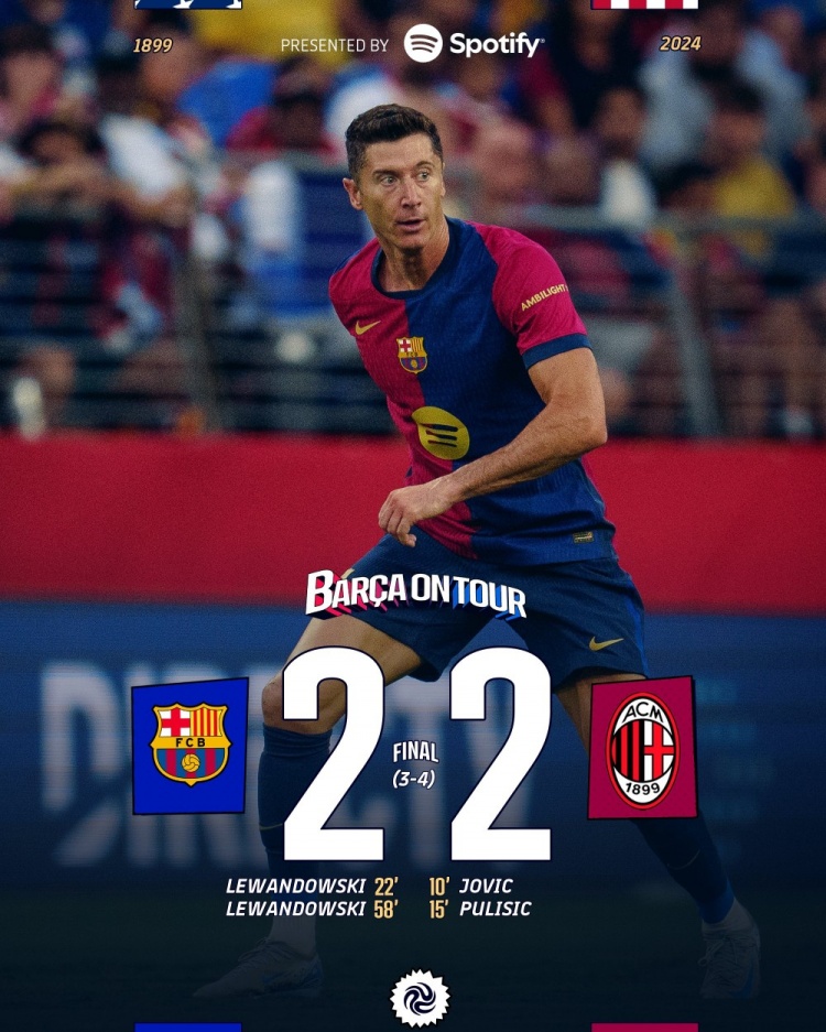 普利西奇传射莱万双响扳平 AC米兰2-2巴萨 点球大战米兰4-3胜