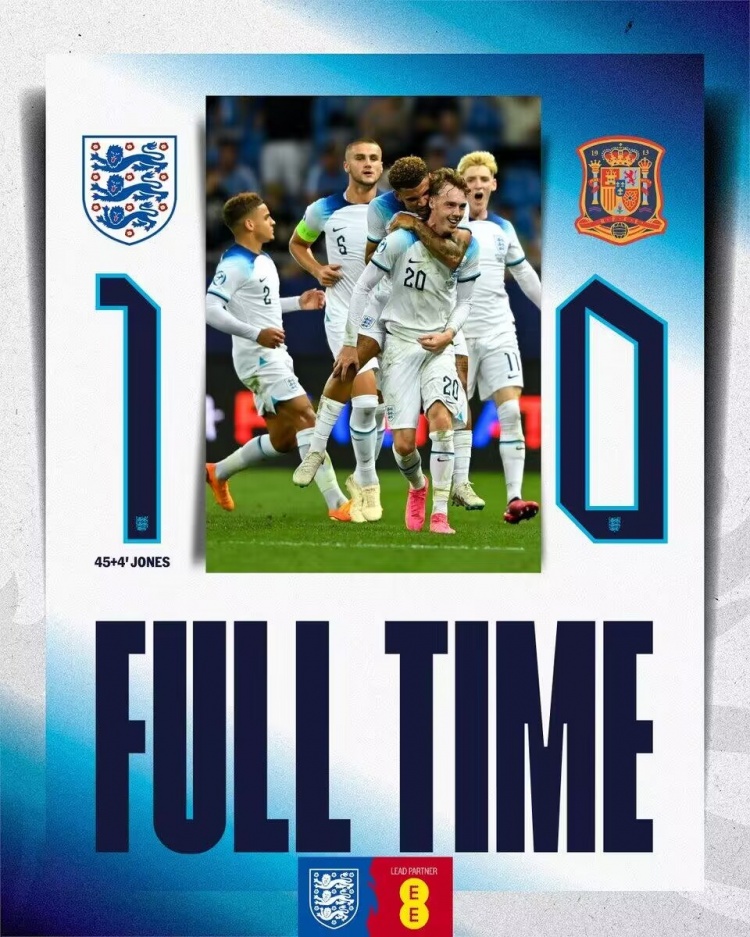 7月8日讯 北京时间7月9日0:00,欧青赛决赛英格兰U21vs西班牙U21的比赛,上半场双方互有攻守,科尔维尔头球中楣,帕尔默任意球打在柯蒂斯-琼斯身上折射破门,下半场特拉福德补时扑点,最终英格兰国青1-0西班牙国青零失球夺冠,英格兰国青队史第3次&时隔39年再次问鼎。