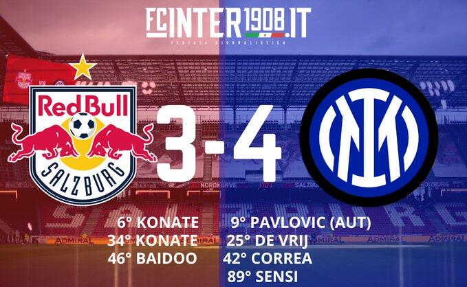 8月10日讯 北京时间8月10日凌晨1点整,2023年国际足球友谊赛展开角逐,国际米兰对阵萨尔茨堡红牛。上半场索默首秀送点,随后又出击失误,迪马尔科造乌龙,德弗里反超比分,卡里姆梅开二度,科雷亚再度反超,下半场拜多扳平,森西绝杀,最终国际米兰4-3战胜萨尔茨堡红牛。